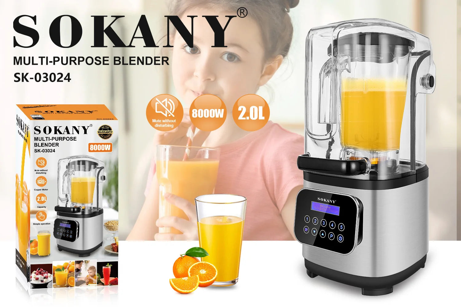 Sokany SK-03024 Digital Silent Blender – 8000W High-Speed Motor, 2L Soundproof Jar